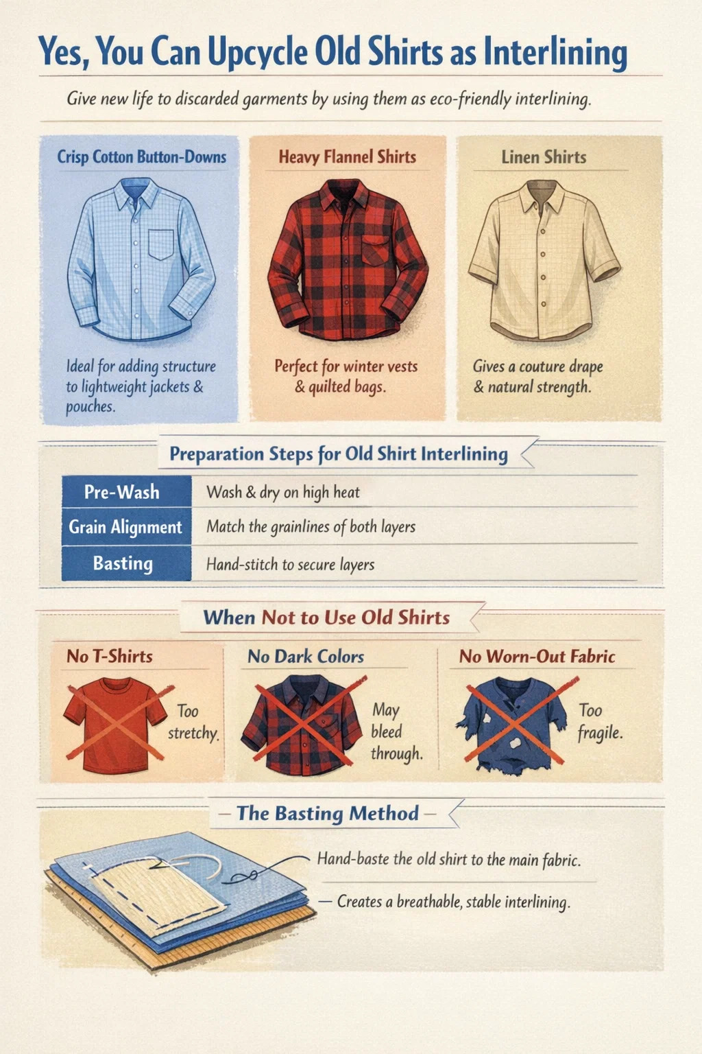 Câu trả lời ngắn gọn vang dội vâng . Những chiếc áo sơ mi cũ hoặc chưa qua sử dụng có thể là một lựa chọn tuyệt vời, thân thiện với môi trường và tiết kiệm chi phí. xen kẽ cho các dự án may khác nhau. Sử dụng quần áo bỏ đi làm lớp bên trong là một truyền thống lâu đời trong ngành may đo, được gọi là "làm đồ". Tuy nhiên, thành công phụ thuộc hoàn toàn vào việc kết hợp các đặc tính chất liệu của áo sơ mi—chẳng hạn như hàm lượng sợi, kiểu dệt và trọng lượng—với nhu cầu của dự án mới của bạn. Khi được thực hiện đúng cách, một chiếc áo sơ mi cotton hoặc flannel cũ sẽ mang lại cảm giác ôm sát, ổn định và ấm áp cần thiết mà không cần đến chất ổn định tổng hợp mua ở cửa hàng.