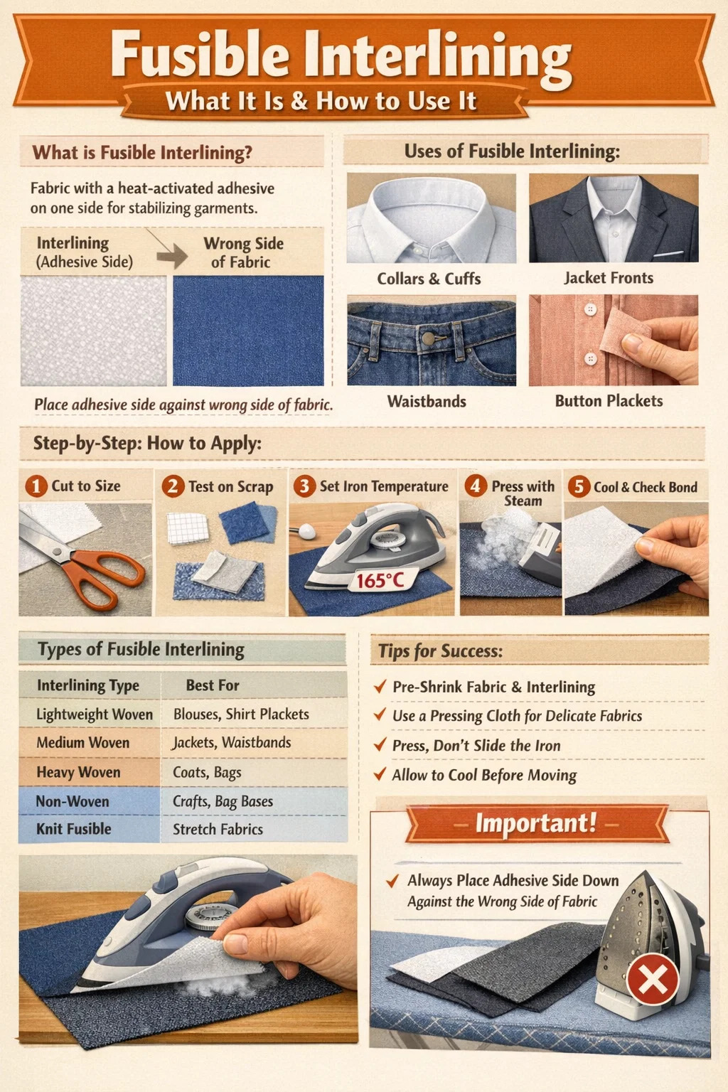 Mặt dính của lớp lót dễ nóng chảy luôn hướng về phía mặt trái của vải - đây là quy tắc quan trọng nhất. Làm ngược lại điều này có nghĩa là các lớp lót liên kết với tấm sắt hoặc vỏ bàn ủi thay vì vải của bạn, điều này làm hỏng cả lớp lót và có thể là bàn ủi.