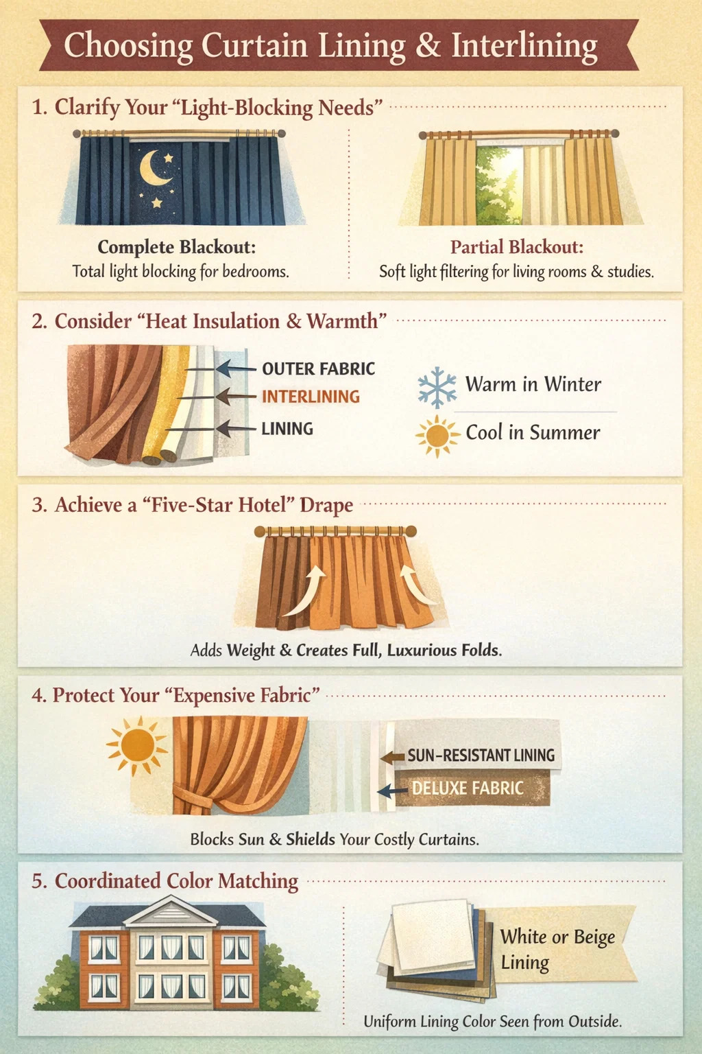 Lựa chọn lớp lót rèm và xen kẽ giống như mặc "quần lót" và "áo khoác ngoài" cho rèm cửa của bạn. Lớp vải bên ngoài quyết định độ đẹp của rèm, trong khi hai lớp bên trong này quyết định chức năng và độ rủ tốt của chúng.