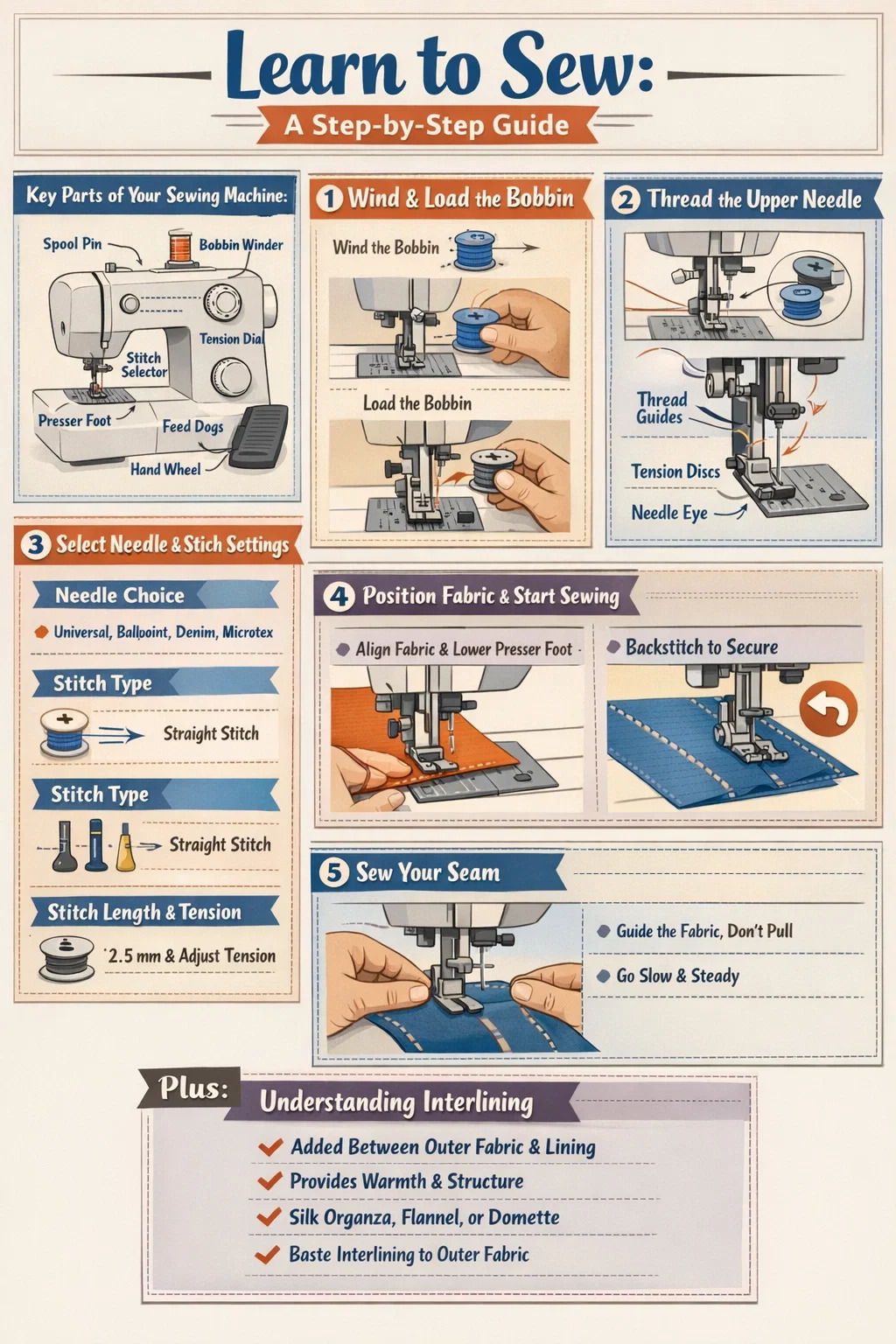Học cách vận hành máy may từng bước đơn giản hơn hầu hết những người mới bắt đầu mong đợi. Quy trình cốt lõi bao gồm năm hành động: thiết lập máy, cuộn và nạp suốt chỉ, xâu kim trên, chọn mũi khâu và may. Khi đã nắm rõ những nguyên tắc cơ bản này, bạn có thể giải quyết mọi thứ, từ đường viền cơ bản đến trang phục có cấu trúc sử dụng xen kẽ — một lớp ẩn được may giữa lớp vải bên ngoài và lớp lót để tăng thêm phần thân, hình dáng và độ ấm. Hướng dẫn này hướng dẫn chi tiết từng bước để bạn có thể đi từ người mới bắt đầu hoàn toàn đến người tự tin.