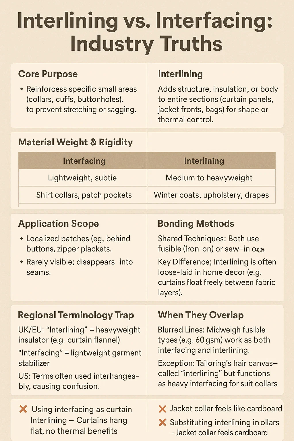 Vương quốc Anh/EU: "Xen kẽ" = chất cách điện nặng (ví dụ: vải flannel rèm). "Giao diện" = chất ổn định quần áo nhẹ.
