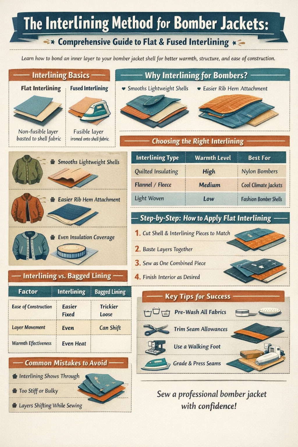 cho a classic nylon MA-1 style bomber, use a pre-quilted interlining basted flat to each panel — this is both historically accurate and practically sound. cho a fashion bomber in heavier fabric, a soft flannel or fleece interlining gives excellent results with minimal bulk. For a fully decorative or special-occasion bomber in velvet or brocade, a lightweight underlining keeps the shell fabric supported and reduces distortion at seams and hems without adding any unwanted stiffness.