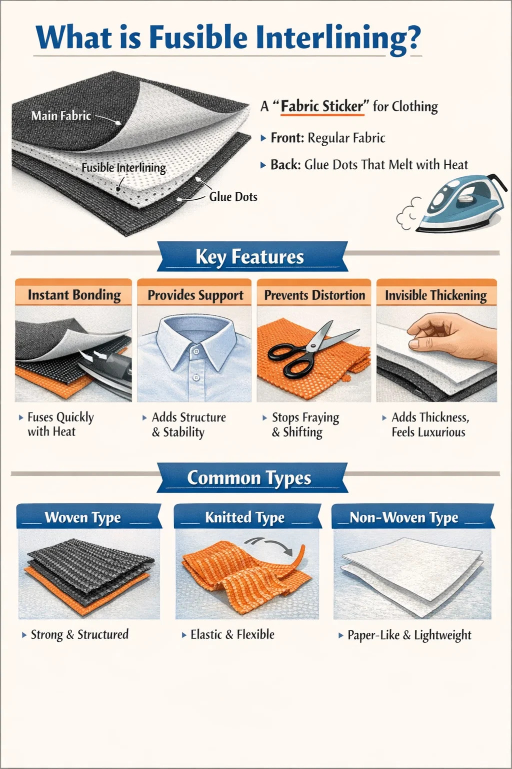 Liên kết tức thì: Đây là tính năng lớn nhất của nó. Bạn chỉ cần đặt nó lên mặt sau của tấm vải chính và ủi bằng bàn ủi hoặc máy ép nhiệt. Nhiệt độ làm tan chảy các chấm keo ở mặt sau, khiến lớp lót và vải may liên kết chặt chẽ với nhau.