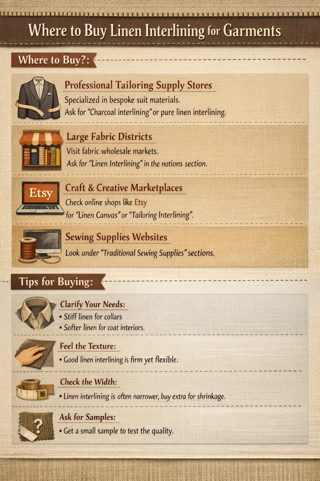 Nếu bạn đang có nhu cầu mua vải lanh xen kẽ hoặc giao diện cho việc may mặc, có một số nguồn đáng tin cậy mà bạn có thể khám phá. Vì vải lanh là chất liệu tương đối cao cấp được sử dụng trong các bộ vest đặt riêng và quần áo may sẵn chất lượng cao nên bạn sẽ cần tìm ở các cửa hàng bán vải chuyên dụng.